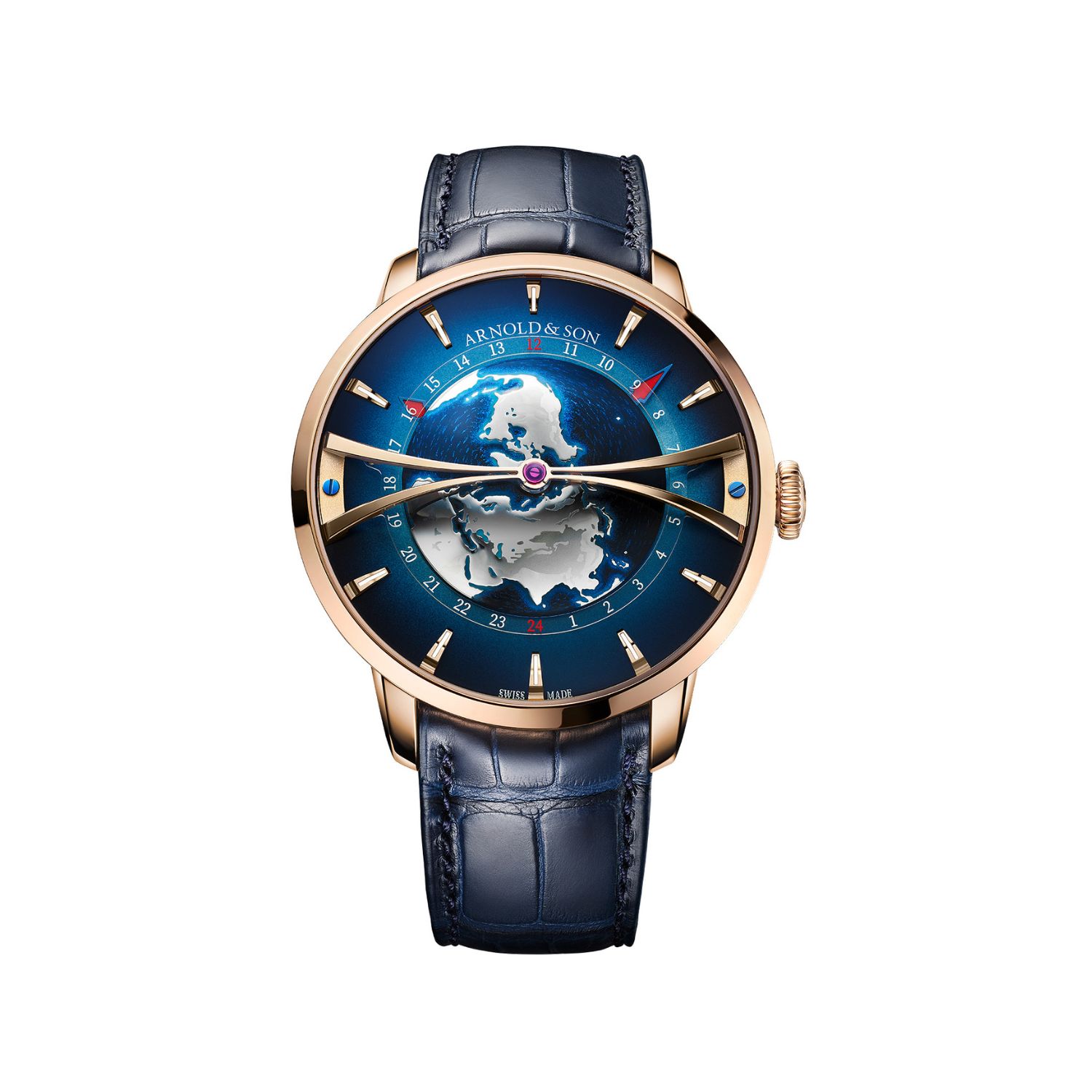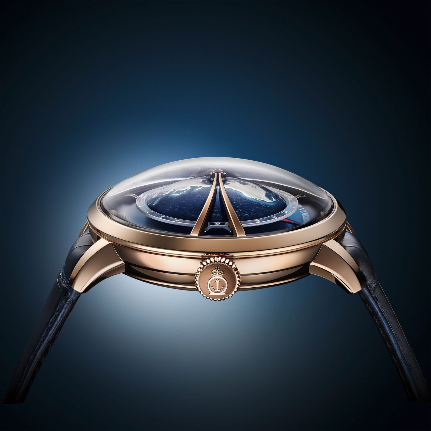 The Globetrotter Gold impresses with its 45 mm red-gold case and a majestic 3D dome of the Northern Hemisphere, hand-sculpted with detailed continents and deep, richly painted blue oceans. The iconic openworked red-gold bridge with a central ruby supports the universal time axis and stands as the model’s signature element.