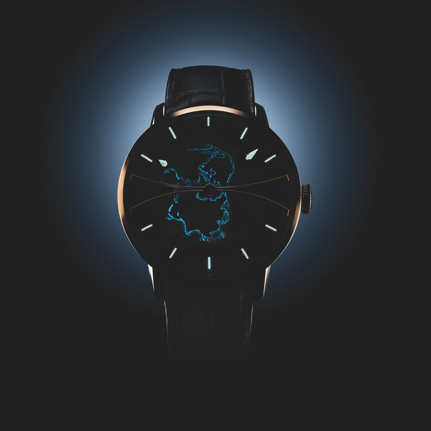 - lacquered in shades of sunlit blue three-dimensional appliqués in 18-carat rose gold with Super-LumiNova