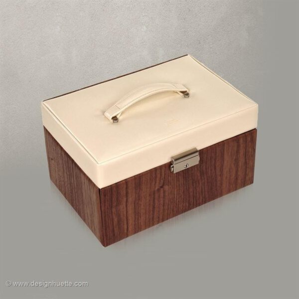 Jewelry box Sacher Jette in Nordic Style with integrated mirror, automatic case (heave itself while opening the jewelry box), eight small drawers, 2 ring pillows, a spacious shelf on top, 2 drawers, split into 2 shalvers and 5 shelvers. A classic and robust carrying handle. Dimensions (W x H x D) 27 x 13,5 x 19 cm. Weight 1,4 kg.