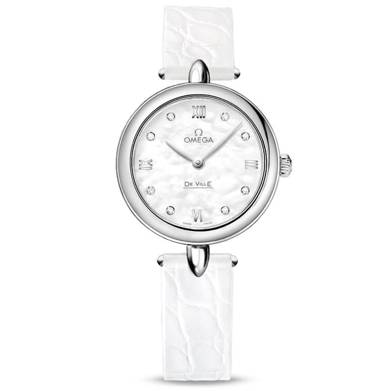 This elegant timepiece is powered by the OMEGA calibre 4061 and features a white leather bracelet with a polished buckle.