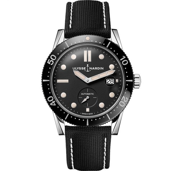 Ulysse Nardin Diver Le Locle Brand Product Mens watch Collection Diver Diameter 42,2 mm Material stainless steel Movement caliber UN-320, self-winding Water-resistance 100 m Function date, oversizer seconds-hand, unidirectional rotatable bezel Dial black with vintage design Strap fabric strap, pin buckle Model number 3203-950 Price 9.600 € State in stock I have interest Product is not in stock at the moment, please contact the store