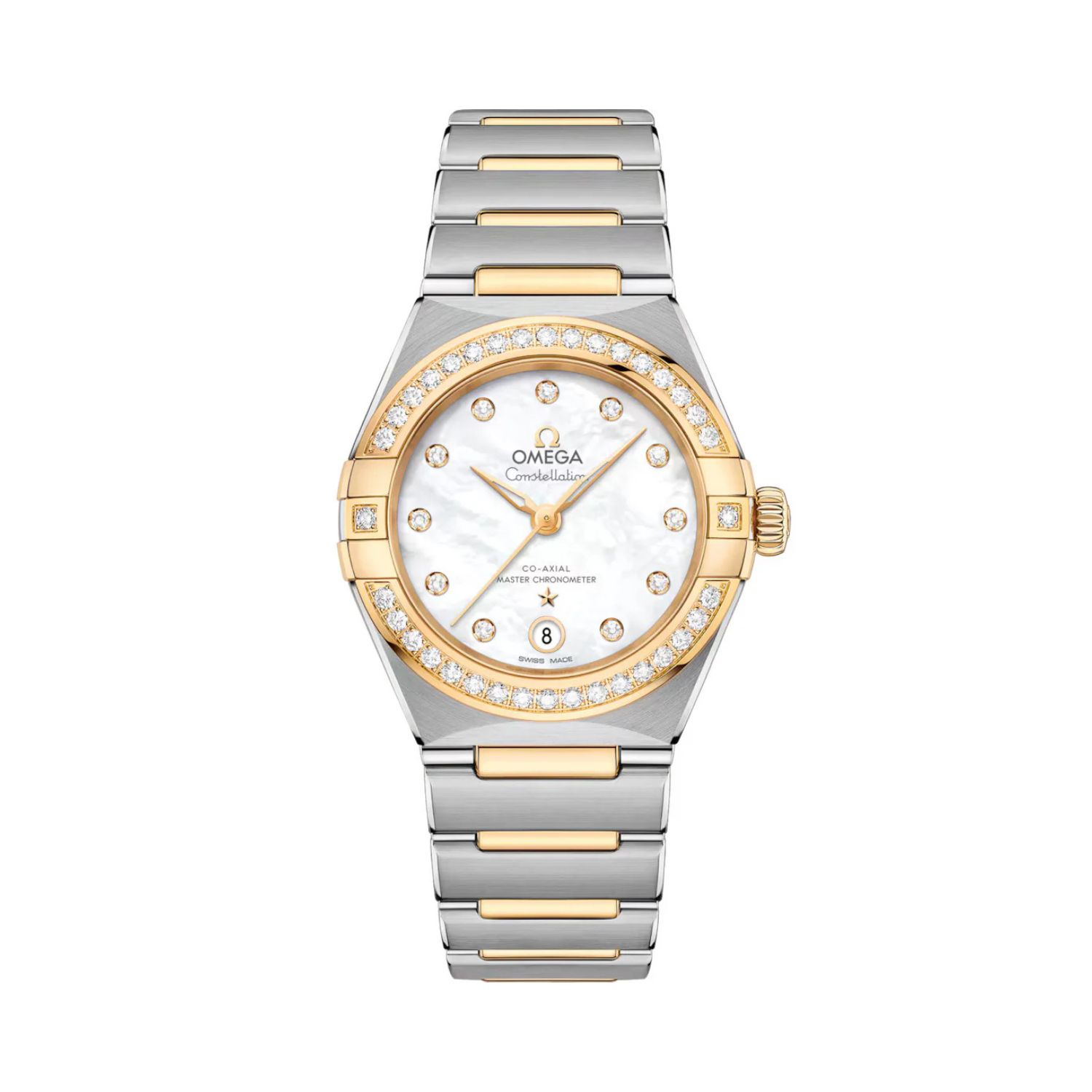 Elegantné Constellation spájajú ikonické polmesiace, „claws“ a mono-rang náramok. Tento 28 mm model z kombinácie 18K žltého zlata a ocele zdobí diamantmi vysádzaná luneta a perleťový ciferník s diamantovými indexmi. Ručičky, logo aj Constellation hviezda sú z 18K žltého zlata.