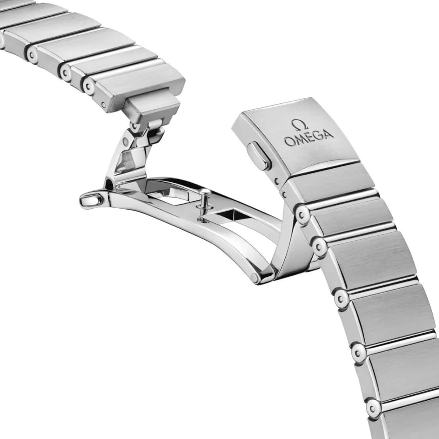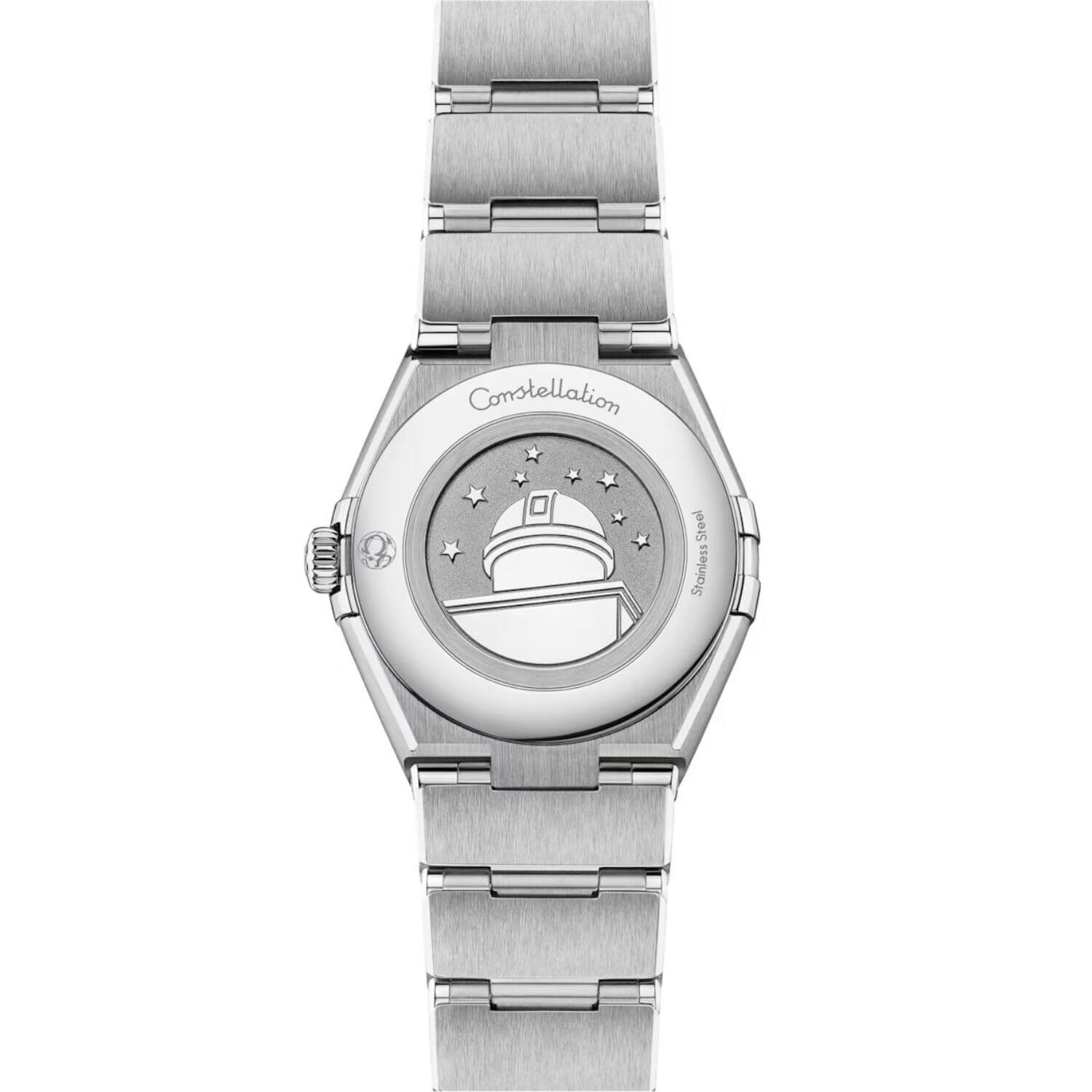 OMEGA Constellation 28 mm vyniká ikonickými polmesiacmi a charakteristickými bočnými prvkami na púzdre. Model z nehrdzavejúcej ocele má lunetu s rímskymi číslicami, perleťový ciferník s diamantovými indexmi a zafírové sklíčko. Ručičky, logo OMEGA aj obruby diamantov sú z 18K bieleho zlata. Hodinky poháňa kaliber OMEGA 4061 a zadná strana nesie emblém observatória Constellation.