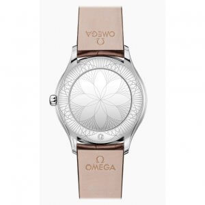 S diamantmi a oceľou krásne kontrastuje slnkom brúsený hnedý číselník potiahnutý priesvitným lakom a zdobený jedinečnými aplikovanými rímskymi číslicami a diamantovo leštenými PVD ručičkami vo farbe Moonshine™ Gold. Číselník dopĺňa hnedý kožený remienok s prackou Trésor. Hodinky poháňa OMEGA Caliber 4061 za špeciálnym zrkadlovým chrbtom so vzorom „Her Time“.