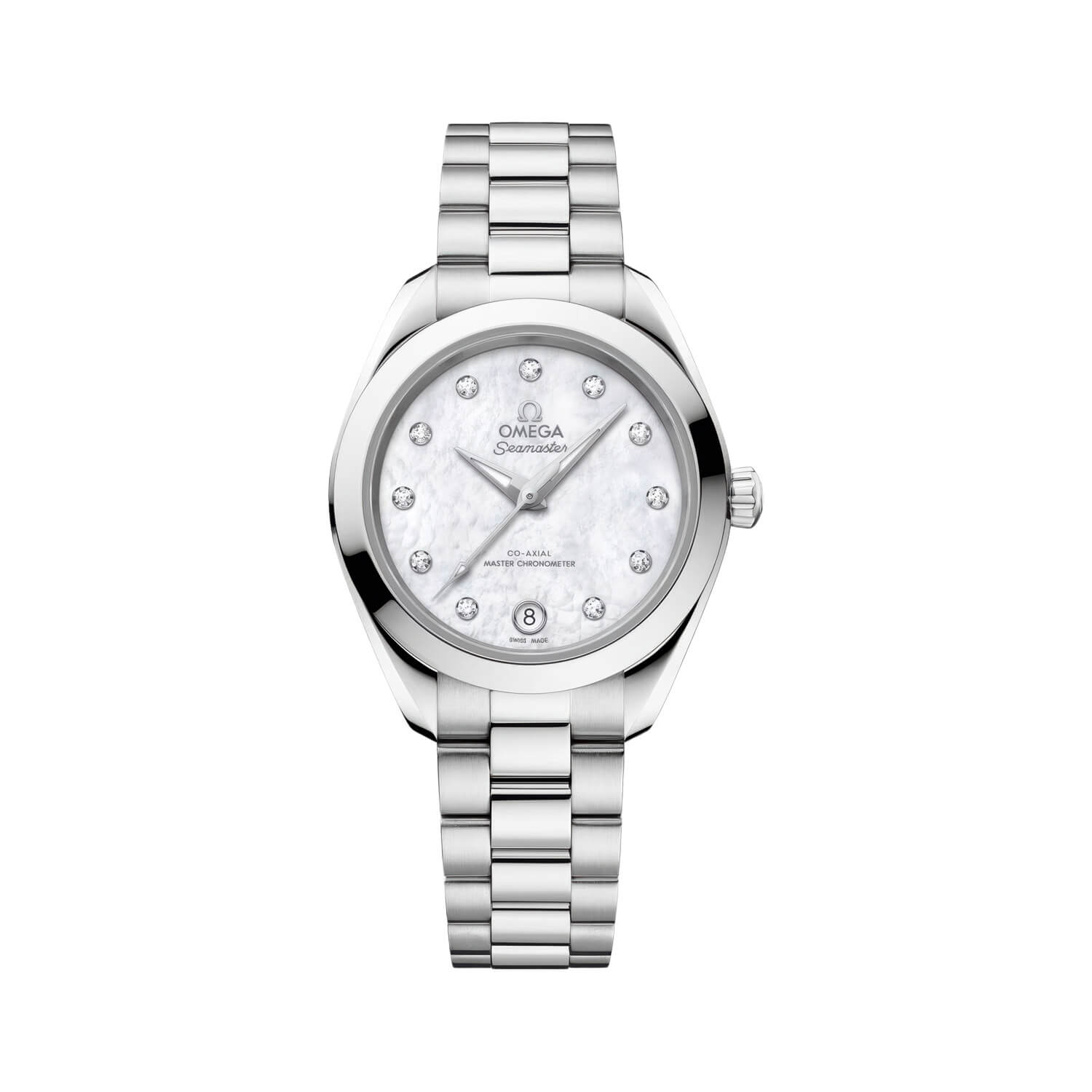 Elegantné hodinky OMEGA Seamaster Aqua Terra v 30 mm prevedení spájajú jemnú ženskosť s precíznym hodinárskym majstrovstvom. Biely perleťový ciferník zdobený diamantmi a prvkami z 18K bieleho zlata dopĺňa Co-Axial Master Chronometer kaliber 8750 s certifikáciou METAS – záruka výnimočnej presnosti a spoľahlivosti. Nadčasový model na oceľovom náramku, ktorý je ideálny pre každý deň aj výnimočné príležitosti.
