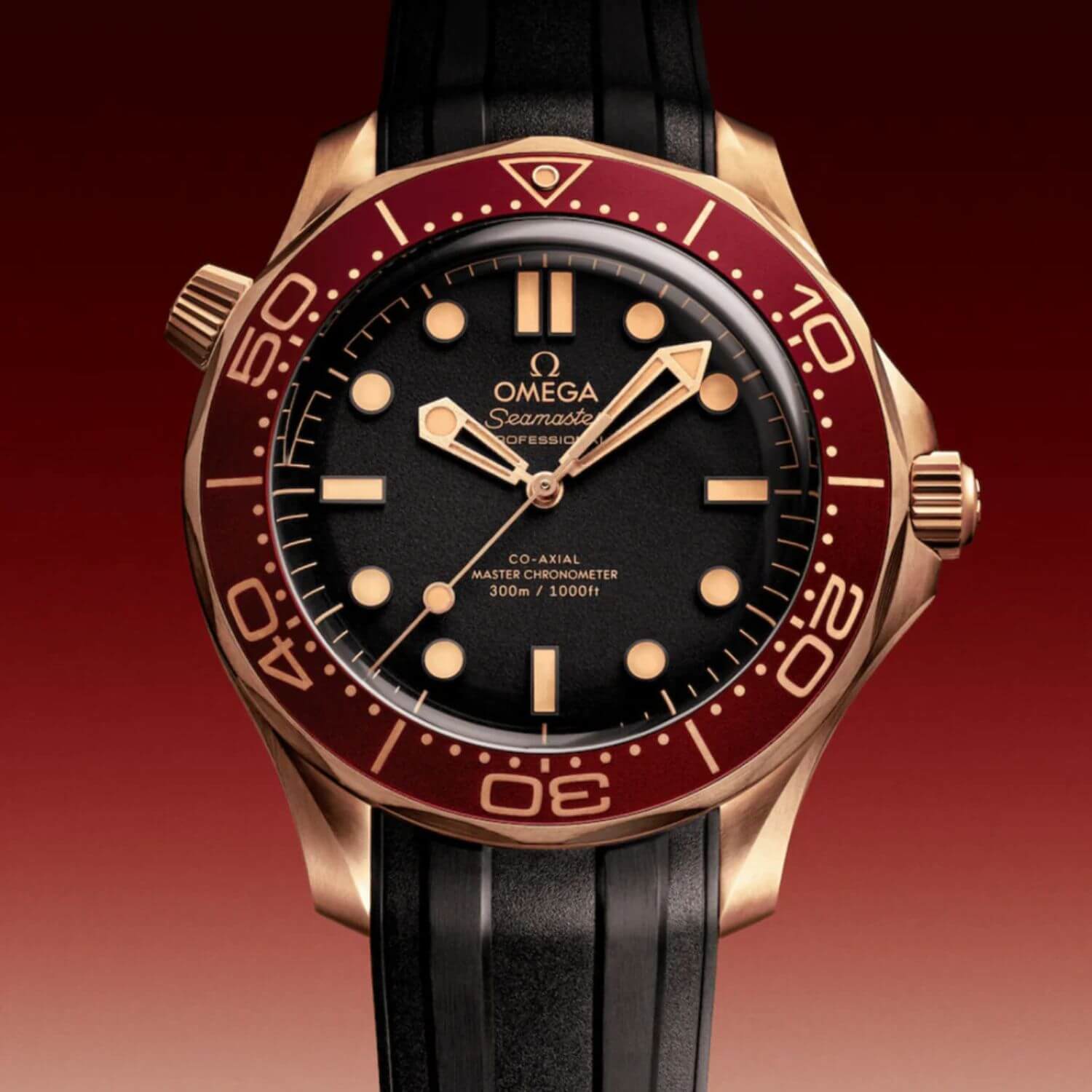 Hodinky OMEGA Seamaster Diver 300M si od roku 1993 získali legendárny status medzi milovníkmi mora. Moderná kolekcia spája ikonickú tradíciu s najvyspelejšou technológiou a dizajnom značky OMEGA. Tento 42 mm model je vyrobený z exkluzívneho Bronze Gold a zdobí ho vínová eloxovaná hliníková luneta s potápačskou stupnicou z vintage Super-LumiNovy. Pieskovaný čierny ciferník dopĺňajú ručičky z PVD 18K Bronze Gold a čiernené indexy, ktoré jemne žiaria vďaka Super-LumiNove s patinovým odtieňom. Ciferník dotvárajú hnedé detaily a logo OMEGA. Model je osadený na čiernom gumenom remienku s prackou a poháňa ho kaliber Co-Axial Master Chronometer 8806, viditeľný cez zafírové puzdro.