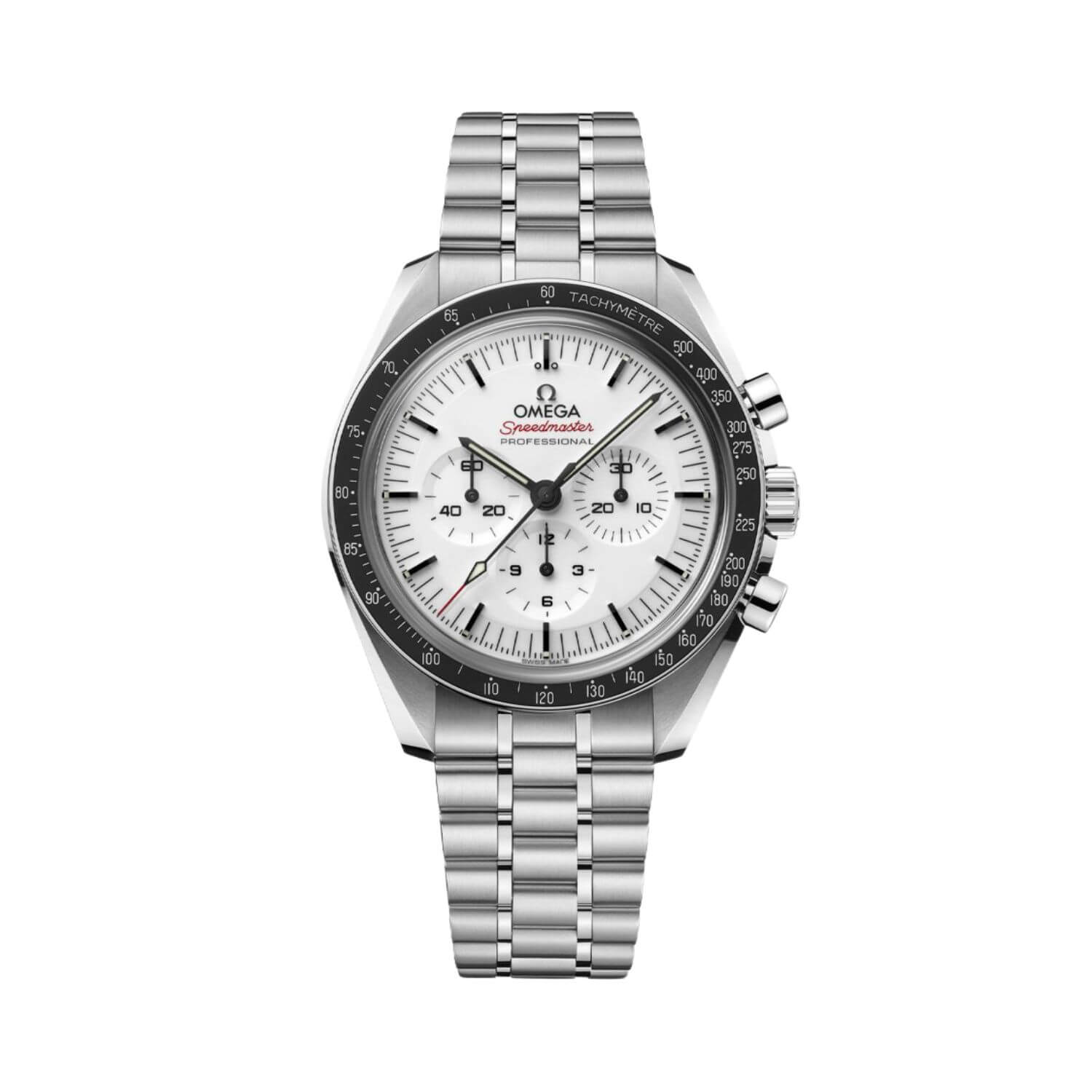 Tieto 42 mm hodinky z nehrdzavejúcej ocele sú vybavené zafírovým sklom na prednej strane aj na priehľadnom viečku puzdra. Dizajn je inšpirovaný 4. generáciou modelu Speedmaster, ktorá bola nosená na Mesiaci – obsahuje asymetrické puzdro, biely lakovaný stupňovitý ciferník s aplikovaným logom a indexmi OMEGA, ručičky v štýle Moonwatch a známy „bod nad 90“ na čiernej eloxovanej hliníkovej lunete.