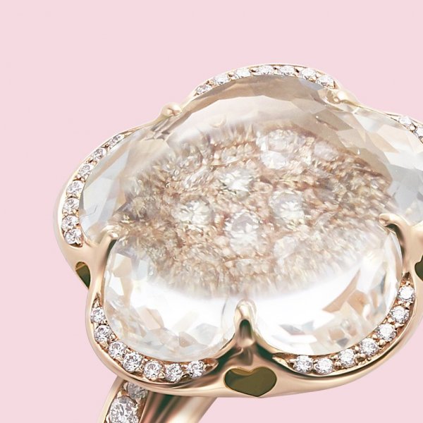 V ikonickej kolekcii Bon Ton je kráľom drahokam – nádherný transparetný kremeň rock crystal. Charakteristický tvar kvetu s piatimi lupeňmi je symbolom talianskeho šperkárskeho domu od nepamäti. Všimnite si aj vzácne kvetinové intarzie na zadnej strane, pripomínajúce tvar čipky.