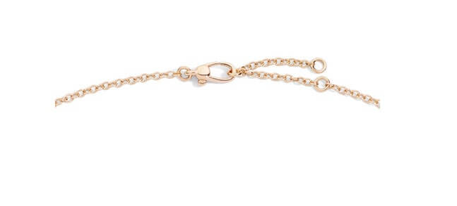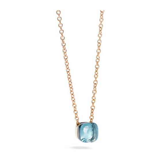 Nudo Petit prívesok s modrým topásom a retiazkou z 18-karátového ružového zlata. Reprezentuje, resp. odkazuje na štýlovú a zásadnú expresivitu kultového prsteňa Pomellato. Charakteristikou je „nahý“ kameň, ktorý je k dispozícii v rôznych, neobvyklých farbách.