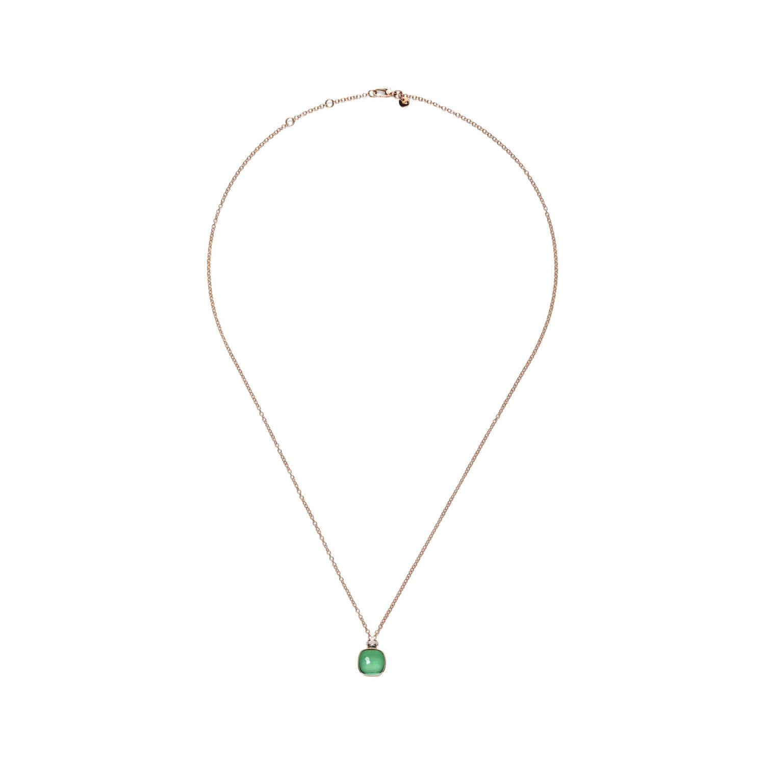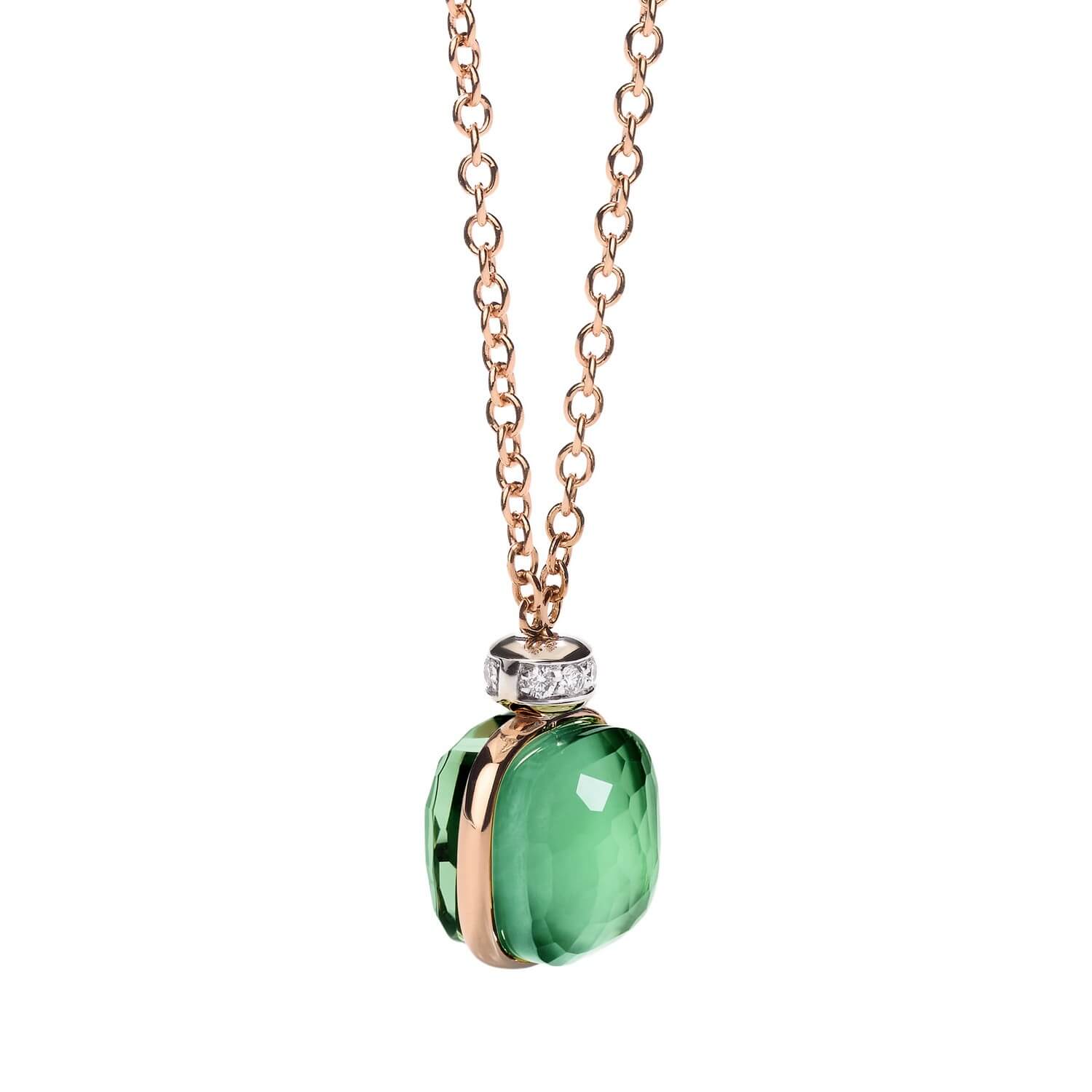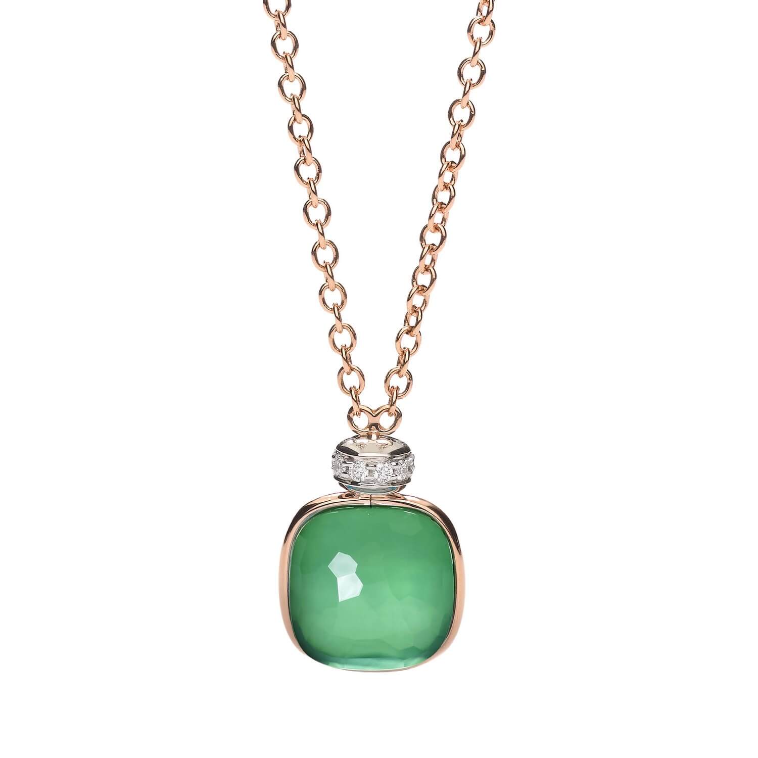 Ikonický Pomellato Nudo náhrdelník z 18K ružového a bieleho zlata oslavuje krásu farieb v dokonalej harmónii. Výrazný doublet spája transparentný prasiolit s hlbokým zeleným achátom, čím vzniká sofistikovaný, viacvrstvový odtieň zelenej, ktorý sa mení v závislosti od svetla a pohybu. Jemné diamantové pavé na bielom zlate podčiarkuje jeho lesk a nadčasovú eleganciu.