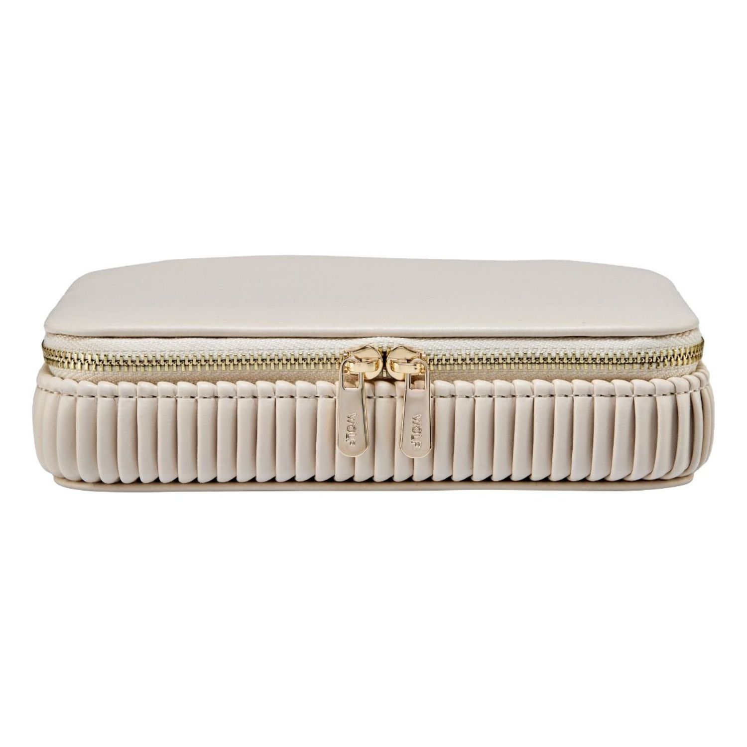 Šperkovnica Bella je stelesnením sofistikovaného luxusu. Jej hladký vegánsky povrch dopĺňajú dokonale riasené bočné strany a kovanie v zlatej povrchovej úprave.