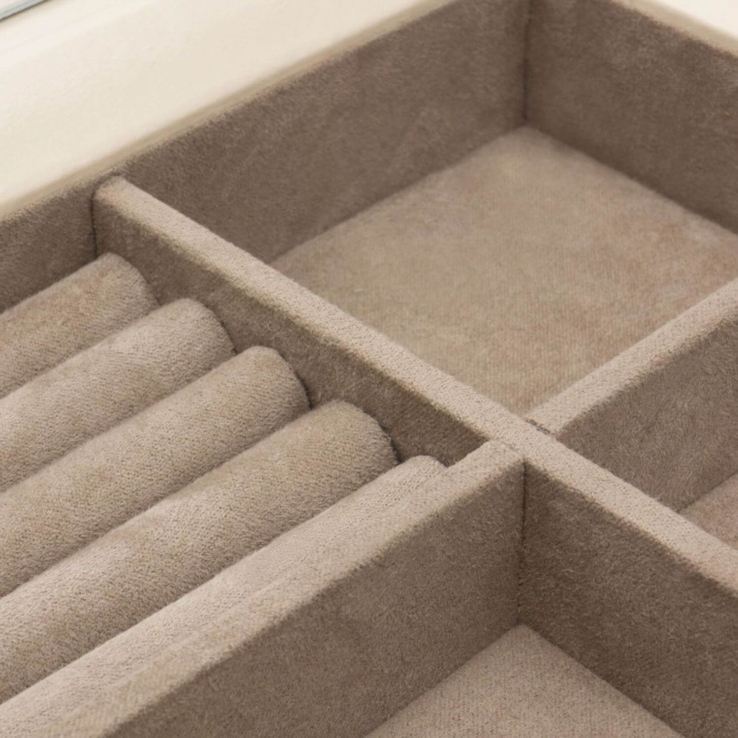 Nadčasová šperkovnica, ktorá spája eleganciu 50. rokov so súčasným luxusom. Caroline Medium vyniká jemným prešívaním v diamantovom vzore z mäkkej kože a zlatým kovovým kovaním. Táto rafinovaná šperkovnica v odtieni slonovej kosti je dokonalým domovom pre vaše vzácne šperky a rodinné dedičstvá.
